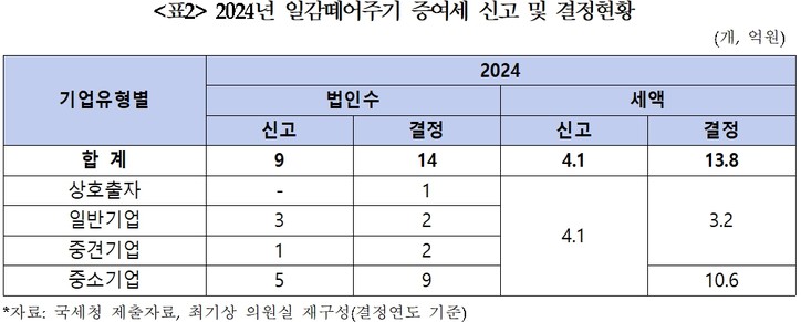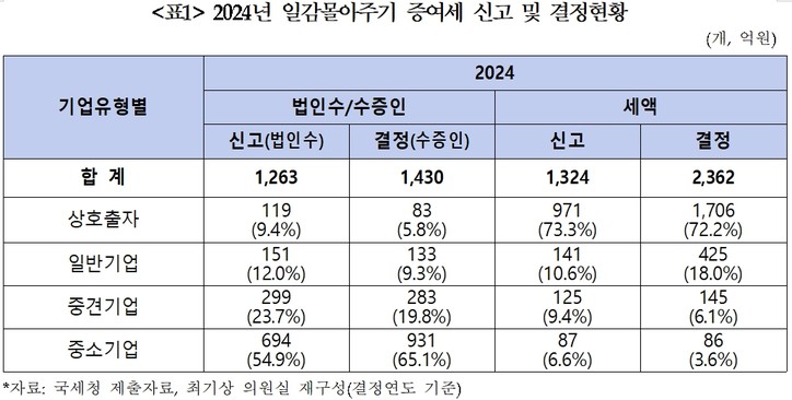 최기상 의원에 따르면 일감몰아주기는 대부분 대기업인 상호출자제한기업에서 이루어졌다. `24년 이들에게 부과된 증여세는 1706억원으로 전체 일감몰아주기 증여세 납부액의 72.2%를 차지했다. 뒤를 이어 일반기업이 425억원(18%), 중견기업이 145억원(6.1%), 중소기업이 86억원(3.6%)을 차지했다. 일감떼어주기는 `24년 결정세액(13억8000만원)의 76.8%가 중소기업에 부과됐다.