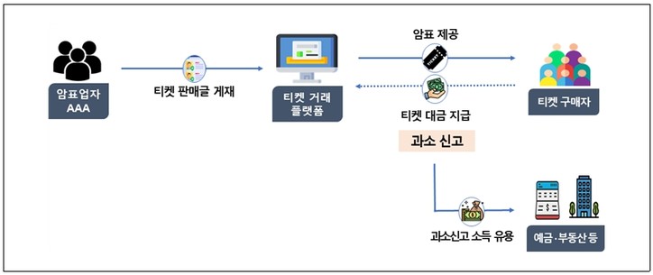 정가의 10배 이상으로 암표를 재판매하며 얻은 수익을 과소 신고하고 예금・부동산 등에 유용한 암표업자
