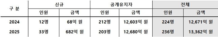 올해 공개 대상 체납자 236명의 총 체납액은 1조 3362억 원으로 지난해와 비교해 공개 인원은 12명 증가, 전체 체납액은 691억 원 증가했다.