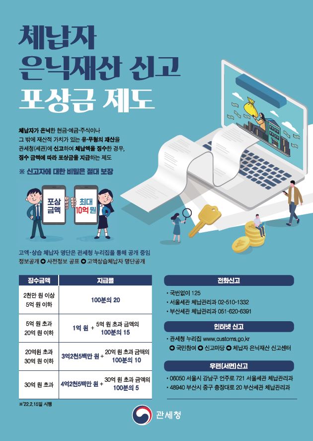 신고 포상금 제도를 활성화하기 위해 2022년 2월부터 포상금 지급률을 상향하여 운영 중이며, 누구나 손쉽게 신고할 수 있도록 관세청 누리집(정보공개 > 사전정보 공표 > 고액상습 체납자 명단공개)에서 바로가기 기능을 제공하고 있다.
