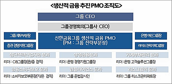 신한금융은 지난 9월 생산적 금융 추진을 위한 그룹 통합 관리조직인 ‘생산적 금융 PMO(Project Management Office)’를 신설했다. 이를 통해 은행·카드·증권·라이프·캐피탈·자산운용·저축은행 등 주요 자회사가 참여하는 통합 관리체계를 구축했다.
