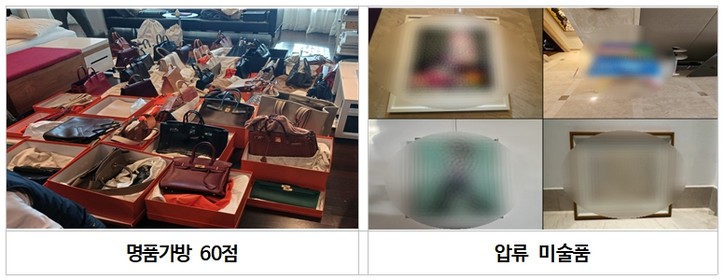 ○ 체납자의 실거주지에서 현금, 순금 10돈, 미술품 4점, 명품 에르메스 가방 60점 등 총 9억원 상당 압류함