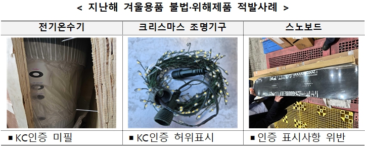 온열기구·전기손난로 등의 난방용품과 스노보드·헬멧 등의 동절기 스포츠용품, 조명기구·완구 등의 크리스마스용품에 대해서는 국표원의 전문인력과 합동으로 안전인증 미필·인증 허위표시 여부와 부품변경 또는 위변조 여부 등을 확인한다.
