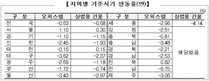 지역별로 보면, 오피스텔 기준시가는 3.62% 하락한 대구지역이, 상업용 건물 기준시가는 4.14% 하락한 세종지역의 가장 많이 내렸다.