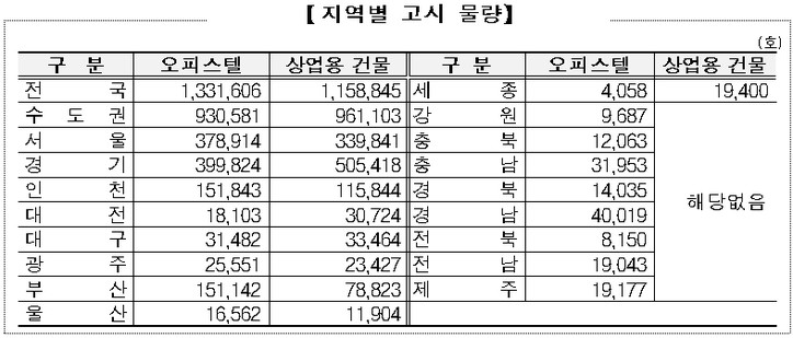 고시 물량은 전년보다 3.5 % 증가한 249만호(오피스텔 133만호·상가 116만호)이며, 이 중 서울·경기·인천 등 수도권이 189만호(오피스텔 93만호·상가 96만호)로 전체 고시 물량의 약 76 %를 차지하고 있다.