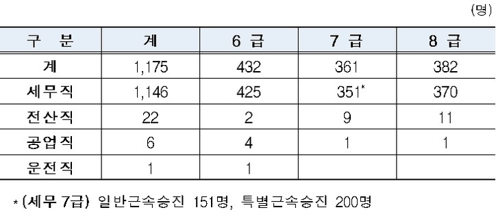 승진인원은 6급 432명, 7급 361명, 8급 382명으로 총 1175명이며, 이 중 세무7급에는 일반근속승진 151명과 특별근속승진 200명이 포함돼 있다.