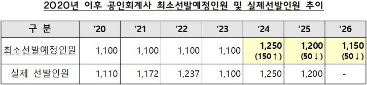`26년도 최소선발예정인원은 미채용 합격생 누적에 따른 수급부담, 회계법인의 매출·수익 정체, 非회계법인의 회계사 채용수요, 수험생 예측가능성 등을 종합적으로 고려하여 결정되었으며, `25년 보다 최소선발예정인원이 소폭 감소(50명↓)했다.