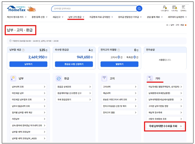 홈택스 접속(인증서 또는 생체인증)→납부·고지·환급→기타→국세 납부대행수수료율 조회 에서 확인 가능합니다.(’25.12.2.개통예정)