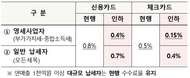전체 0.1%p 일괄 인하되고, 영세사업자에게는 추가로 인하됩니다.