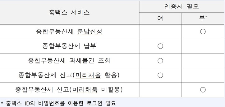 □ 홈택스에서 제공되는 종합부동산세 관련 서비스 중 인증서 필요여부는 다음과 같습니다.