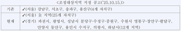 □서울시 서초구·강남구·송파구·용산구가 ’25년 과세기준일(6.1.) 기준 조정대상지역에 해당하므로, ’25.10.15. 주택시장 안정화 대책 때 새로 지정된 조정대상지역은 올해 부과되는 종합부동산세에 영향을 미치지 않습니다.