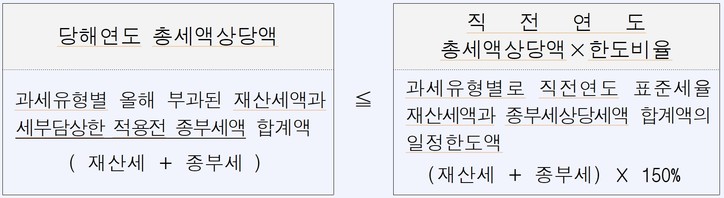 - 직전연도 표준세율 재산세액 및 세부담상한 적용 전 종합부동산세 상당세액 합계액의 150%를 초과하는 경우 그 초과된 세액은 “0”으로 보는 것입니다.