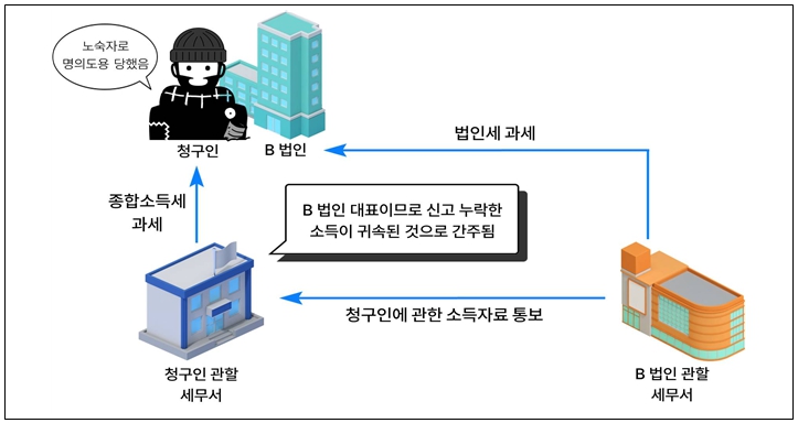 ○(세무서) B법인 관할세무서는 신고 누락한 소득이 대표자인 청구인에게 귀속된 것*으로 보고 과세자료를 통보하였고, 청구인 관할세무서는 이를 근거로 청구인에게 종합소득세를 부과