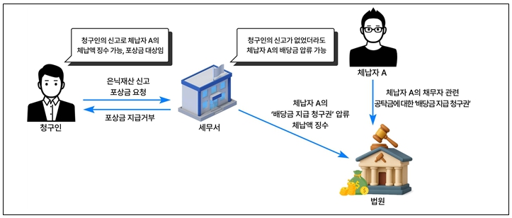 ○(청구인) 세무서에 체납자A가 배당받을 금액이 있으니 이를 압류해 징수하라고 신고하고, 은닉재산 신고 포상금 지급*을 요청