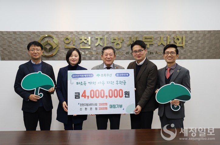 이번 전달식은 인천지방세무사회와 신한은행이 체결한 매칭기부 협약에 따라 마련된 것으로 인천지방세무사회 기부액에 신한은행이 동일한 금액을 더해 각 200만원씩 총 400만원의 후원금이 조성됐었다. 후원금은 초록우산을 통해 생계비 지원, 의료비 지원, 보육비 지원 등 아동 복지 사업에 사용될 예정이다.