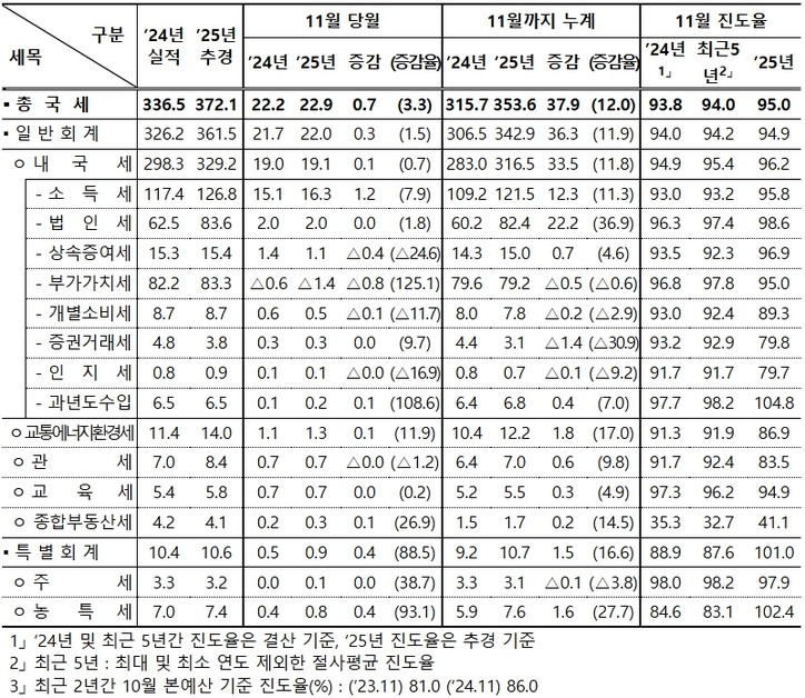 기획재정부가 31일 발표한 ‘국세수입 현황’에 따르면 1월~11월까지 누계 국세수입은 353조6000억원이다. 세수진도율은 95%로 전년보다 1.2%p 높다.