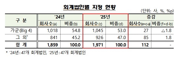 금융감독원은 작년 감사인 지정 회사가 1천971곳으로 전년보다 112곳(6.0%) 증가했다고 26일 밝혔다.