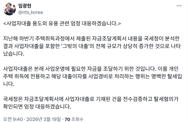 임 청장은 “사업자대출은 본래 사업운영에 필요한 자금을 조달하기 위한 것”이라며 “이를 개인주택 취득에 전용하고 해당 대출이자를 사업경비로 처리하는 행위는 명백한 탈세”라고 설명했다.