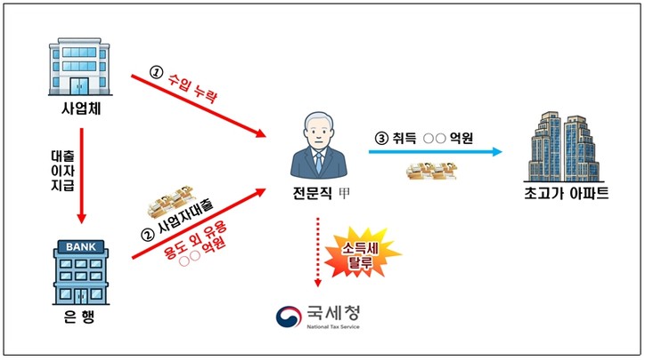 국세청이 확인한 바에 따르면 실제 고소득 전문직 사업자가 강남권 고가 아파트를 수십억 규모의 사업자 대출금과 수십억원의 신고누락된 탈루자금을 사용한 것으로 드러났다. 수년간 수억원의 사업자 대출 관련 이자를 경비 계상해 탈세한 사실도 확인됐다.