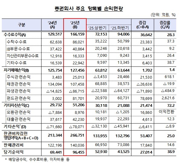 26일 금융감독원이 발표한 '2025년 증권·선물회사 영업실적(잠정)' 자료에 따르면, 증권사 61곳의 지난해 연간 당기순이익은 9조6천455억원으로 전년(6조9천441억원)보다 2조7천14억원(38.9%) 증가했다.
