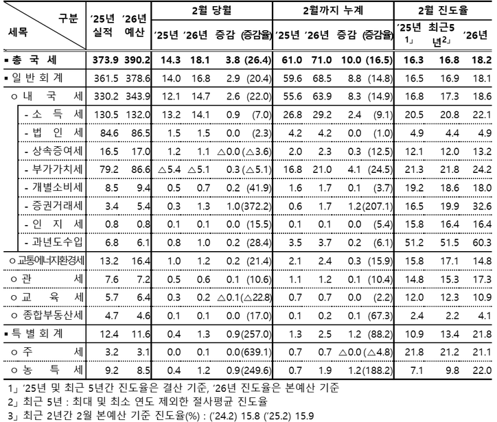 재정경제부가 31일 발표한 `26년 2월 국세수입 현황 자료에 따르면 지난 2월까지 걷힌 국세수입은 71조원으로 집계됐다.