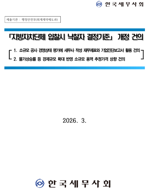 세무사회는 조달청 시설공사 및 공공주택 적격심사 기준의 경영상태 평가방법과 관련하여 추정가액 2억원 미만에 불과한 ‘소규모 공사’에 공인회계사의 감사보고서 또는 검토보고서를 별도로 요구하고 있는 것은 실효성도 없고 중소기업에 과도한 부담이 되고 있다고 지적했다.