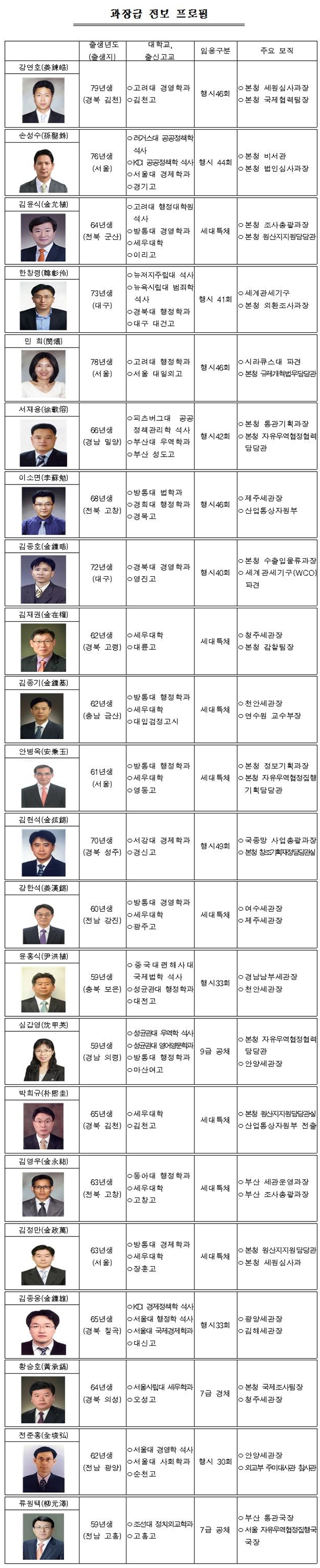 관세청은 6일 관세청 조사총괄과장에 서재용, 국제조사팀장에 이소면, 김포공항세관장에 김재권 씨 등 23명의 과장급 전보인사를 단행했다. 7일자 부임이다.