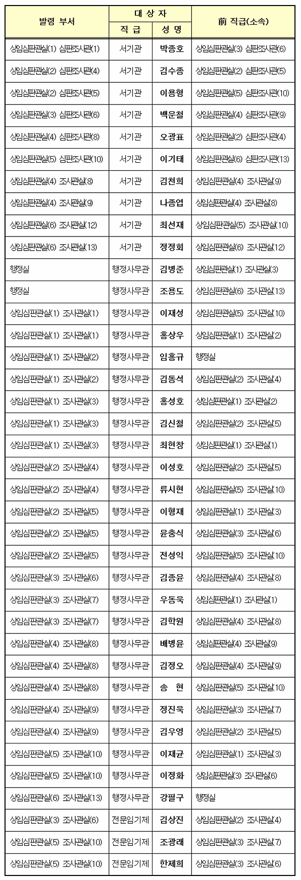 조세심판원은 21일 제3상임심판관실 박종호 서기관을 1심판관실 1심판조사관으로, 김수종 2심판관실 5심판조사관을 2상임심판관실 4조관으로 이동시키는 등 상임심판관실 심판조사관(서기관) 및 행정사무관 등 38명의 전보인사를 단행했다. 부임일은 22일자다.