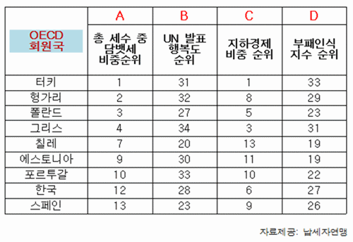 납세자연맹은 특히 “총 세수중 담뱃세비중이 높은 나라는 높은 부패지수 등 사회적 투명도가 낮고 지하경제비중이 높은 나라로, 불공정한 세제로 소득불평등이 심해 국민행복도 역시 낮게 나타난다”는 점을 강조했다.
