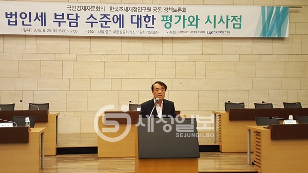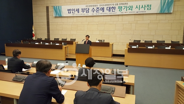 25일 오후 3시 서울 중구 대한상공회의소 의원회의실에서 국민경제자문회의와 한국조세재정연구원은 적정 법인세율 관련 정책토론회를 개최해 법인세율 인상관련 논쟁에 대한 객관적인 근거를 제시하기 위해 ‘법인세 부담 수준에 대한 평가와 시사점’이라는 논의의 장을 마련했다면서 이같이 밝혔다.