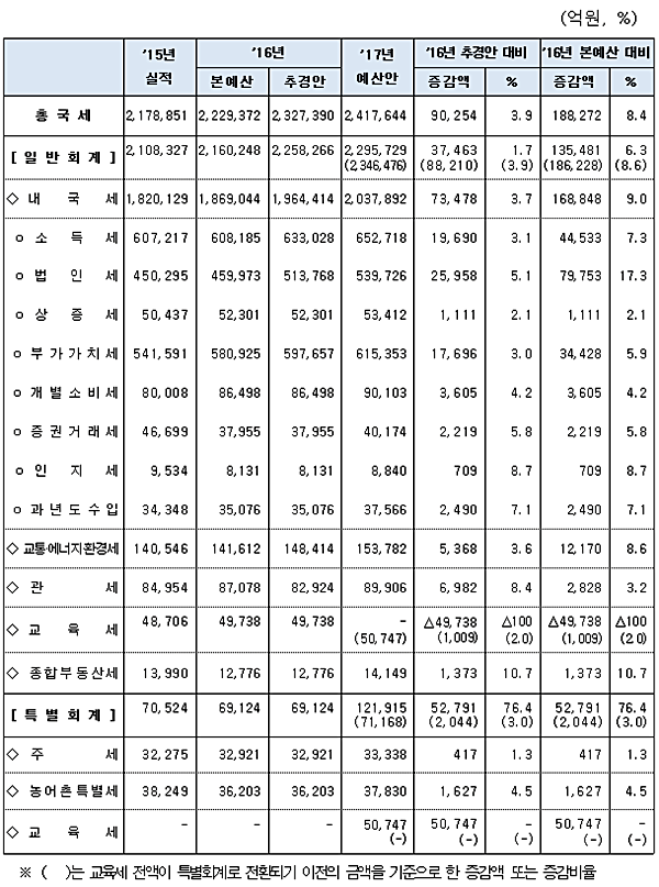◆ ’17년 세목별 국세 세입예산안 세정일보 (sejungilbo) 기자의 다른기사 저작권자 © 세정일보 무단전재 및 재배포 금지 최신 기사 차규근 “배당소득 분리과세율 인하 수용못한다…초부자 감세, 불평등만 심화” 관세사회, 우원식 국회의장 면담…성실신고확인제 필요성 설명 [현장] ‘국세공무원의 꽃’ `25년 하반기 서기관 승진자 30명에 임명장 수여식 국세청, ‘기획·정보·대변인실’ 사무관 자리 하나씩 늘린다 동아쏘시오그룹, 중대재해 대응 모의훈련 실시···심폐소생술·자동심장충격기 실습 NH농협은행, 2025년 ‘디지털금융 혁신대상‘ 최종 우수사례 선정 韓 3분기 경제성장률 26개국 중 3위…내년 2.3% 전망도 등장 차규근 “배당소득 분리과세율 인하 수용못한다…초부자 감세, 불평등만 심화” 추천기사 국세청, 태광산업 세무조사 ‘인프라·레저 계열사’까지…‘5년 치 장부’ 뒤진다 론스타와 13년 분쟁, 국제투자분쟁에서 최초 ‘대한민국 승’…조세주권 지켰다 국세청, 세무공무원 출신 세무사 등 ‘세금 유튜버’ 전수 확인했다 상속세 과세, 유산취득세로 변경 시 ‘국세청 세무조사 조항’도 바뀐다 '마약의 나라' 되나?…청년층 타깃 클럽마약 '케타민의 급습' 5년간 7.3배 급증 [세미콜론] 아직도 이런 폐습이~…국세청 ‘간부 모시는 날’ 고강도 감찰