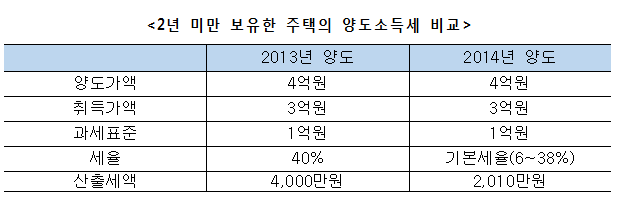 2014년 소득세법 개정으로 주택에 대한 양도소득세 부담이 대폭 낮아졌다. 이에따라 양도 주택을 1년만 보유해도 기본세율을 적용함으로써 주택거래가 점차 활성화되지 않을까 하는 기대가 나오고 있다.