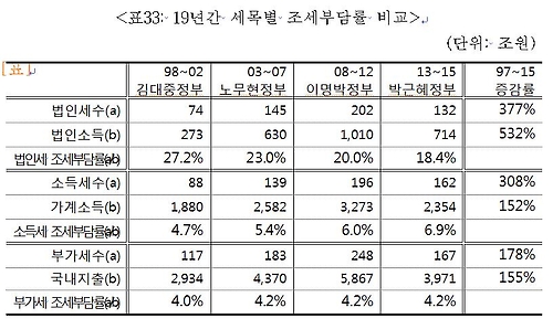 반면 소득세 조세부담률은 김대중 정부 4.7%에서 노무현 정부 5.4%, 이명박 정부 6%, 박근혜 정부 기간 6.9%까지 상승했다.