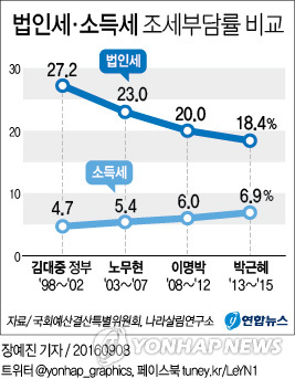 법인세 조세부담률은 김대중 정부(1998∼2002년) 기간 27.2%에서 노무현 정부(2003∼2007년) 23%, 이명박 정부(2008∼2012년) 20%에 이어 박근혜 정부까지 지속적으로 하락하면서 10%대로 내려갔다.