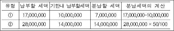 ○ 납부할 세액이 1천만원을 초과할 경우에는 다음의 금액을 납부기한이 경과한 날로부터 1개월(중소기업은 2개월) 이내에 분납 가능